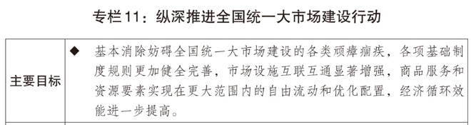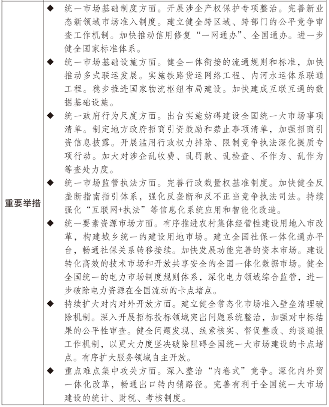 一是加快破除阻碍全国统一大市场建设卡点堵点。制定全国统一大市场建设条例、纵深推进全国统一大市场建设工作方案,持续清理和废除妨碍全国统一市场和公平竞争的各种规定和做法。推动市场准入效能评估省、市、县三级全覆盖。出台地方正府招商引资鼓励和禁止事项清单,规范税收优惠、财政补贴正策。深化综合交通运输体系改革,持续降低全社会物流成本,健全高效顺畅的现代流通体系,加快市场基础设施高标准联通相关改革,实施多式联运攻坚行动,深入推进“一单制”、“一箱制”发展。继续推动大宗商品骨干流通走廊建设,加快建设大宗商品资源配置枢纽,提高国家物流枢纽、国家骨干冷链物流基地、国家邮政快递枢纽的物流集散和区域辐射能力。纵深推进全国统一电力市场建设。加快推动制修订社会信用建设法、价格法等。深化统计、财税、考核制度改革,完善有利于全国统一大市场建设的激励约束机制。