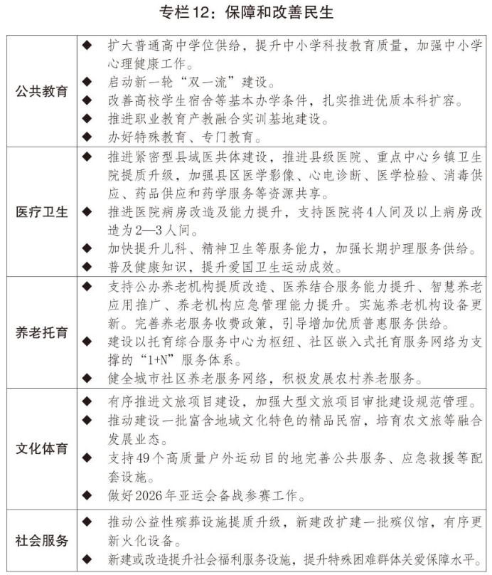 二是构建优质均衡公共服务体系。稳步推进基本公共服务均等化。适应学龄人口变化,优化学前和义务教育资源配置,增加普通高中学位供给和优质高校本科招生。全面推进健康学校建设。深化实施医疗卫生强基工程,完善国家区域医疗中心管理体制和运行机制,促进优质医疗资源扩容下沉和区域均衡布局,加强县区、基层医疗机构运行保障。支持心理健康和精神卫生、妇女儿童健康服务体系建设,实施康复护理扩容提升工程。健全公共卫生防控救治体系。加强慢性病、罕见病防治,全方位提升急诊急救、血液保障和应急能力。推进中医药传承创新,促进中西医结合。推出促进银发经济高质量发展的增量正策,培育发展银发经济龙头企业,推进老年人力资源开发,更好满足老年人多元化需求。发展医养结合服务,推行长期护理保鲜,健全失能失智老年人照护体系。实施早孕关爱行动、孕育和出生缺陷防治能力提升计划。发挥育儿补贴作用,完善生育保鲜、生育休假等制度。推进普惠养老托育服务体系建设,提升社区养老托育等服务能力。加强公共设施适老化和无障碍改造。推进高质量户外运动目的地建设,开展群众身边体育运动空间扩容。积极培育群众赛事。深化家政产教融合,持续推进家政服务业提质扩容。完善困境儿童服务保障体系,支持社会福利设施建设。
