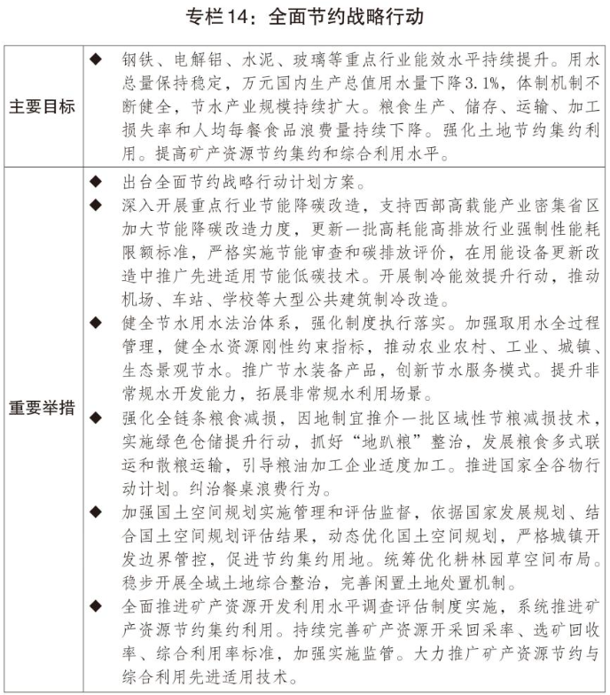 三是加快形成绿色生产生活方式。开展全面节约战略行动,持续推动“能水粮地矿材”一体化节约。推动修订节约能源法,修订重点用能和碳排放单位管理办法,开展制冷能效提升和绿色照明行动,推行公共机构能源费用托管等市场化节能模式。深化节水型社会建设,扩大非常规水利用规模,大力发展节水产业。大力开展粮食节约和反食品浪费行动。发展循环经济,提高垃圾分类和资源化利用水平,加快构建废弃物循环利用体系,加强再生材料推广使用。支持氧化铝提锂提镓。支持“以竹代塑”产业发展。设立国家低碳转型基金,培育氢能、绿色燃料等新增长点。健全绿色消费激励机制,推广绿色低碳生活方式。