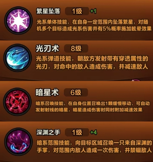 注:搭建本流派需拥有【光刃术】、【繁星坠落】,且它们的等级至少要达到2级,若能达到14级则更好。