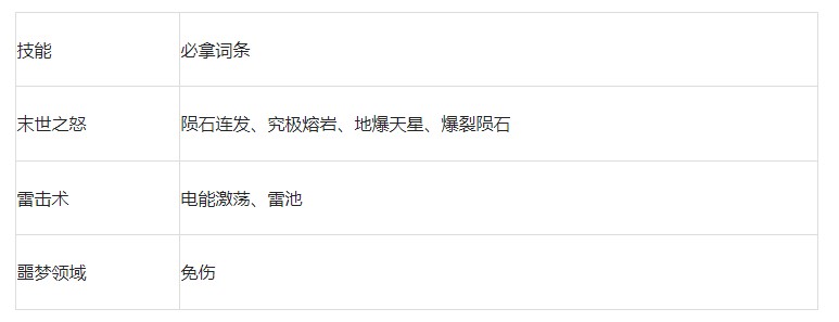 搭配说明:核心技能【末世之怒】会在前期赠送,其它所需技能开局就能拿到,所以此流派适合零氪玩家、首充玩家用来开局。而且【末世之怒】、【火球精灵】都有很出色的群攻能力,配合上雷击术的追踪效果,可快速清理掉关卡里的怪物。【噩梦领域】提供回血、免伤,增强续航。