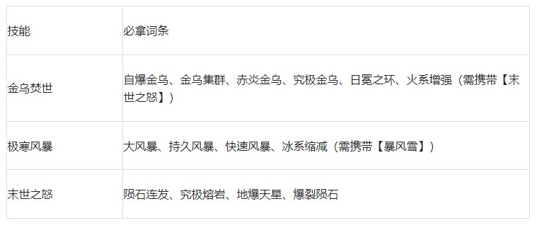 搭配说明:【金乌焚世】首充即可获得,技能使用时覆盖范围可观,搭配【金乌集群】增加金乌数量后,几乎能覆盖近半屏,再结合【极寒风暴】的冰冻效果,能显著提高推关效率。【末世之怒】、【暴风雪】除了能为玩家补足伤害外,也是激活【火系增强】和【冰系缩减】的必要挂件。