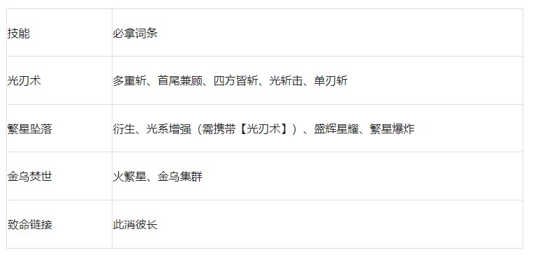 搭配说明:【光刃术】、【繁星坠落】都是伤害很高的光系技能,且【繁星坠落】具备着眩晕敌人的能力,可帮玩家完成控场。【致命链接】利用【此消彼长】帮玩家叠加攻击力,【金乌焚世】补足伤害。