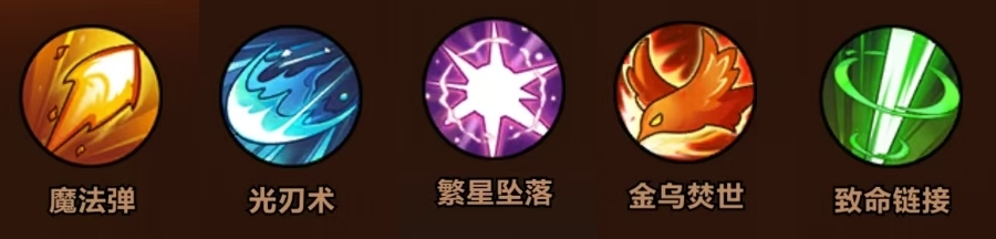 技能选择:魔法弹+光刃术+繁星坠落+金乌焚世+致命链接