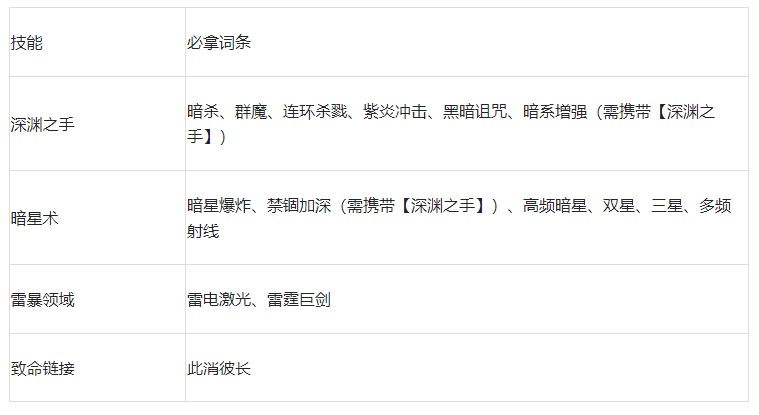 搭配说明:以暗系技能为核心的输出流派,通过【暗星术】、【深渊之手】打伤害。【雷暴领域】与【深渊之手】有联动词条,同时也能为本流派补上不少的输出。【致命链接】用来叠加攻击力。