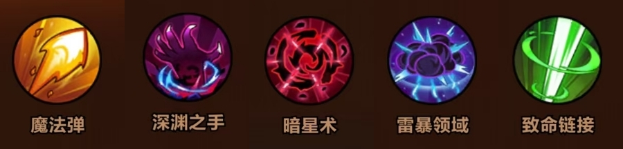 技能选择:魔法弹+深渊之手+暗星术+雷暴领域+致命链接