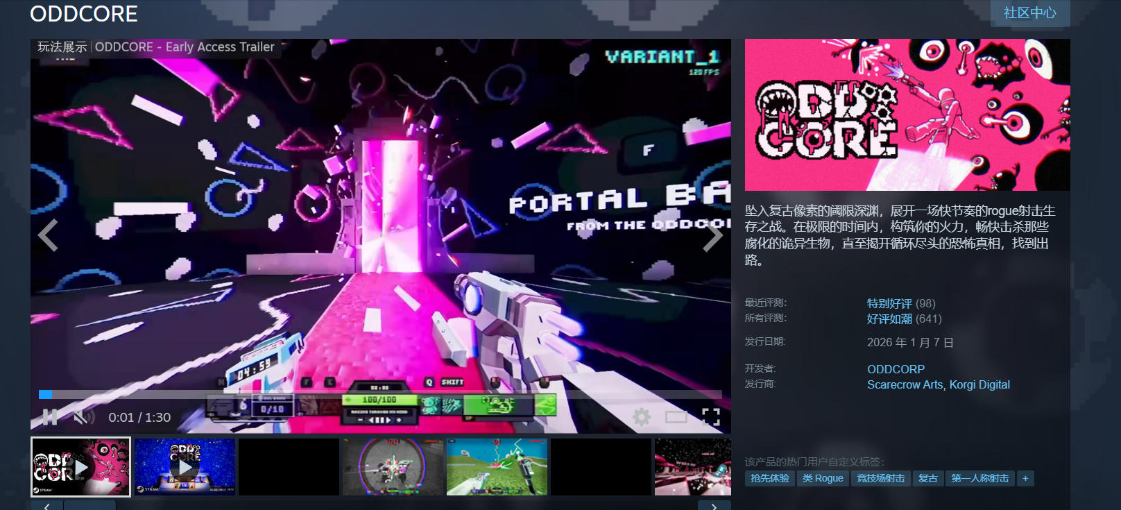 ODDCORE是一款融合Roguelike机制与快节奏FPS射击玩法的生存挑战游戏,单局时长约为5分钟,每局均采用程序化生成的地图、敌人配置与道具分布,带来高度重复可玩性。玩家需在有限时间内应对不断涌现的异变生物,通过精准射击、战术走位与资源管理完成目标。游戏已于Steam平台正式上线,发售日期为2026年1月7日,整体美术风格采用鲜明复古像素与高对比度光影设计,强化紧张感与沉浸式临场体验。