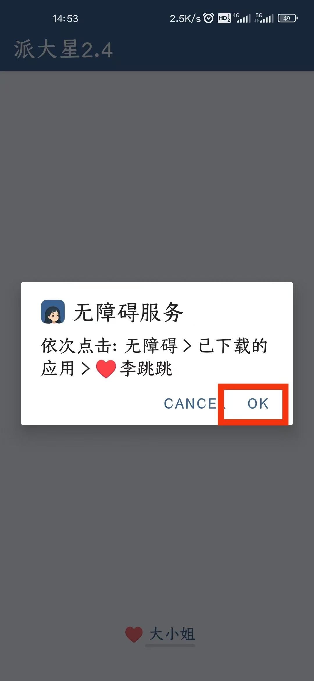 下载应用后首次打开,按照提示逐步完成以下操作:点击主界面红色功能按钮,在弹出的授权窗口中确认开启权限。随后系统会跳转到无障碍设置页面,找到李跳跳并启用其服务。