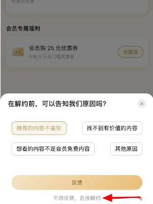 3. 在确认弹窗中点击"不想反馈,直接解约"即可完成操作