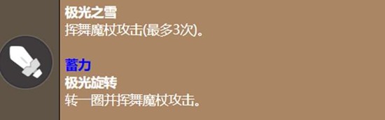 2、她的基本攻击极光之雪是挥舞魔杖进行三段连击。蓄力攻击极光旋转则是挥舞魔杖旋转一圈,能攻击到更大范围的敌人,但在旋转期间自身无法移动,使用时需要注意时机以避免被敌人的技能打断。