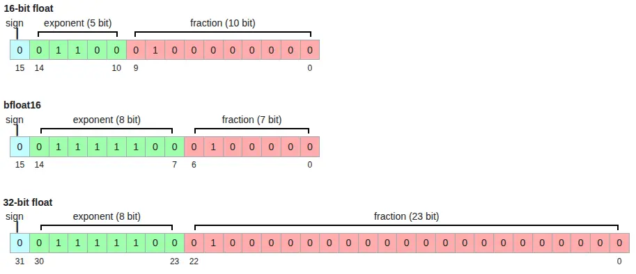 作为一种替代方案,许多机器学习(machine learning - ML)应用现在使用bfloat16,它是对 IEEE-754 float32 的一种修改,只使用 2 bytes。它通过丢弃数值小数部分的最低 2 bytes 来实现,从而保留符号位和指数位不变。这在不相应降低取值范围的情况下,有效降低了浮点值的精度。从 float32 转换为 bfloat16 只是对 float32 值进行一次简单的按位截断,并通过少量处理来实现正确的舍入。