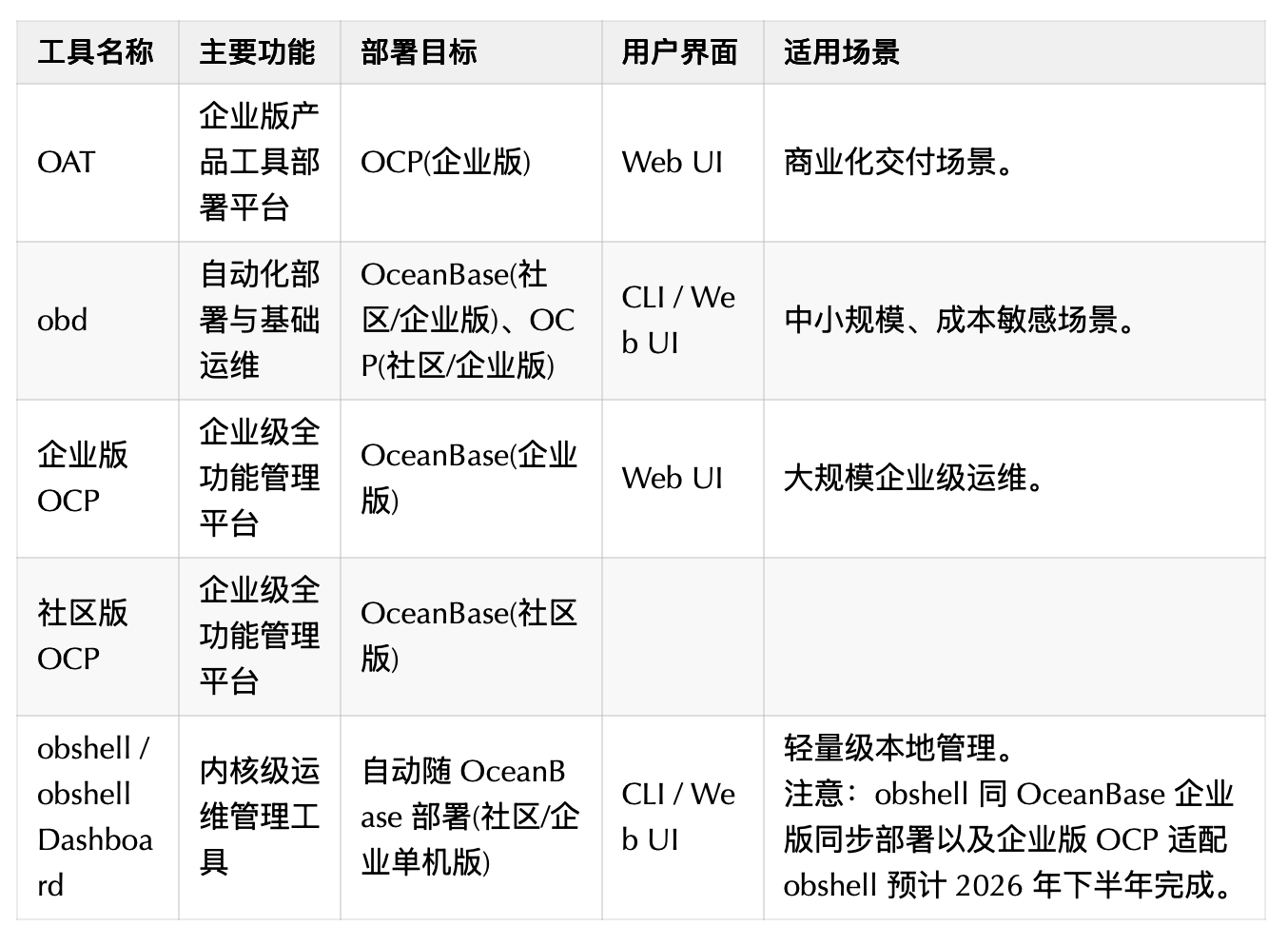 OceanBase的安装部署和运维管理工具可以大致分为三个层级:命令行工具、图形化管理平台,以及内核级工具。它们相互协作,共同服务于数据库的全生命周期管理。