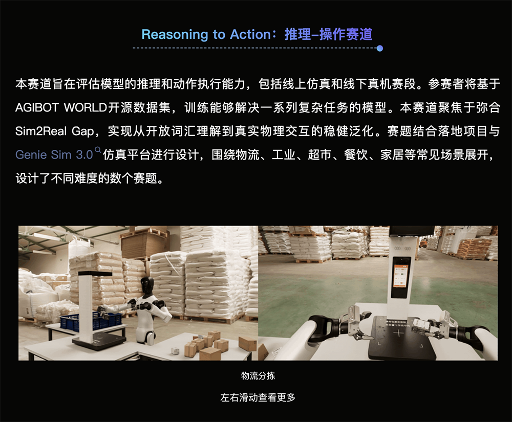 日前,智元机器人启动了一项机器人赛事AGIBOT WORLD CHALLENGE @ ICRA 2026(以下简称 ICRA 2026),两大核心赛道即为Reasoning to Action(推理-操作)和World Model(世界模型)。前者包括线上仿真与线下真机两个阶段,后者则聚焦具身智能中的生成与预测能力,采用线上竞赛方式。