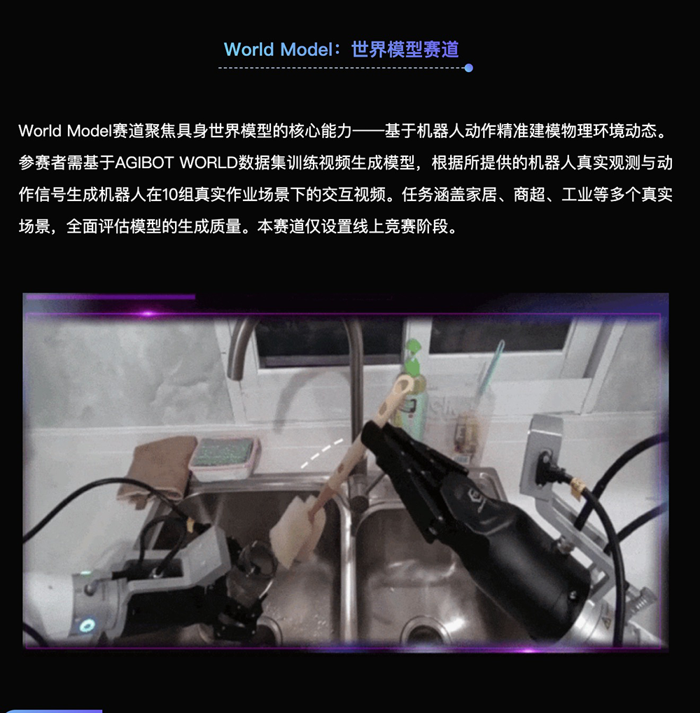沈咏剑介绍,此次赛事中设置的世界模型赛道考察的是模型根据机器人动作建模物理环境动态的能力。参赛者需要基于真实机器人观测与动作信号,训练视频生成模型,生成机器人在多个真实任务场景中的交互视频。