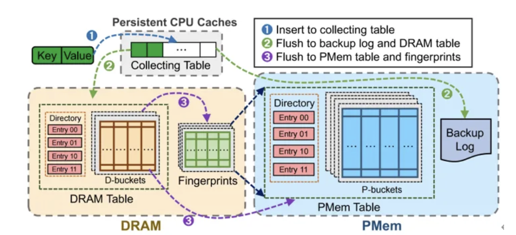 此技术旨在根治向PMem进行小粒度插入时引发的“写放大”(Write Amplification)与频繁桶探测问题。其方案是在持久性CPU缓存中预分配多个与PMem访问粒度对齐的“收集表”(Collecting Table)。新到达的键值对根据哈希值被直接路由到相应收集表,并通过原子操作实现无锁快速插入,从而充分利用缓存的高速与持久化特性。当一个收集表被填满时,其包含的多个键值对将作为一个完整的、与PMem最佳写入粒度匹配的数据单元,被一次性顺序刷写到PMem的备份日志中。这种方法彻底消除了因写入粒度不匹配带来的额外I/O流量,充分利用PMem的写入带宽,同时将零散插入转化为高效批量操作。