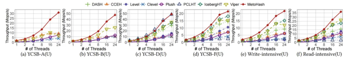 在实际搭载英特尔傲腾持久内存的测试平台上,MetoHash与八种前沿方案进行了全面对比。
