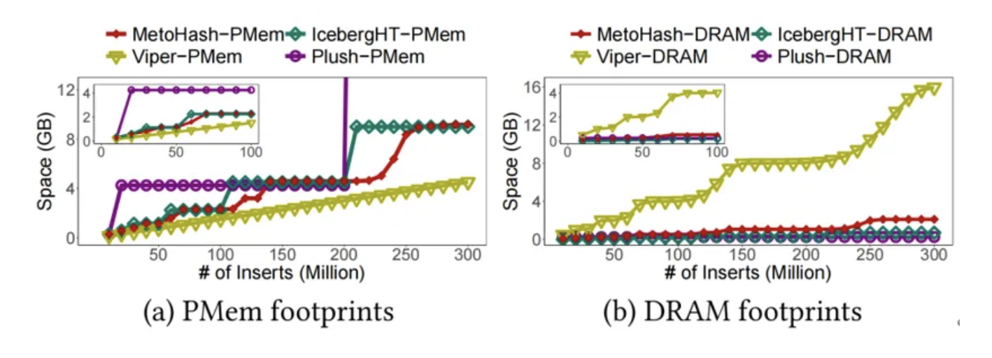 ③内存效率权衡:相比将全部索引存于DRAM的方案(如VIPER),MetoHash的DRAM占用减少86.7%;相比PMem利用率低的方案(如Plush),MetoHash的PMem占用减少86.5%。