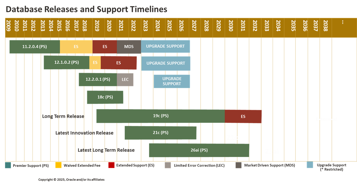值得注意的是,19c的顽强生命力与26ai的推出形成有趣对比。一方面,19c将持续支持到2032年,许多企业仍在深度使用;另一方面,26ai通过RU直接升级的策略,巧妙地将迁移成本降至最低,显示出Oracle在市场引导上的老练。