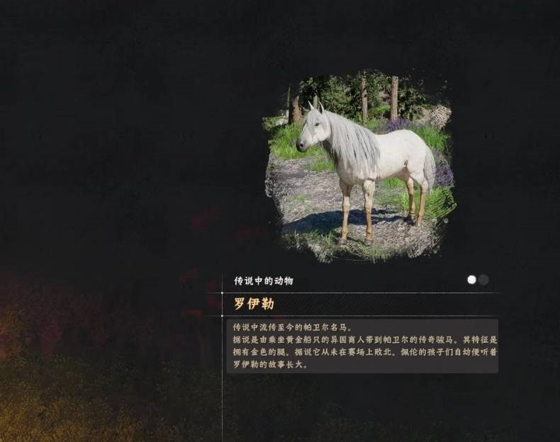 在初始区域埃尔南德北面的佩伦区域(小心雪山上耐力消耗会更快),地图上字母P附近有个小湖泊,在湖边可以找到白色的传说马“罗伊勒”。