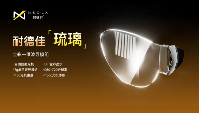 光学设计赋能场景,解锁全天候AR新体验 耐德佳“琉璃”一维自由曲面波导模组,以极致的光学设计,让AR眼镜真正具备全天候佩戴的核心条件,其光学性能精准适配信息提示/AI内容输出、路径导航、图文资讯、视频娱乐等多场景需求。 作为国内AR光学领域的先行者,耐德佳始终以光学设计创新为核心,从自由曲面光学到波导技术,从实验室研发到产业化落地,不断突破AR光学的技术边界。 此次“琉璃”模组的推出,既是耐德佳在自由曲面波导领域的全新成果,更是国产AR光学设计向消费级普及的重要一步。未来,耐德佳将继续深耕光学核心技术,以更多光学设计黑科技,推动AI+AR产业迈向更广阔的未来! 来源:耐德佳显示