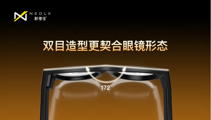 光机采用梯形收边光学结构设计,打破传统光机的方正形态,让光学组件从镜框到镜腿实现自然过渡,配合172°镜面角的光学外形设计,让AR眼镜的光学模组与普通眼镜镜框高度契合,既解决了光学部件的空间适配问题,又从光学结构上避免了佩戴夹头的痛点,实现“光学性能+佩戴体验”的双重优化。