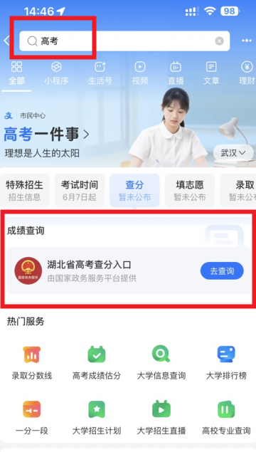 首先打开支付宝APP,在顶部搜索栏输入【高考】关键词,进入专属服务页面后即可看到成绩查询入口。需要提醒的是,当前成绩查询功能尚未开放,建议考生在成绩公布后再进行操作。