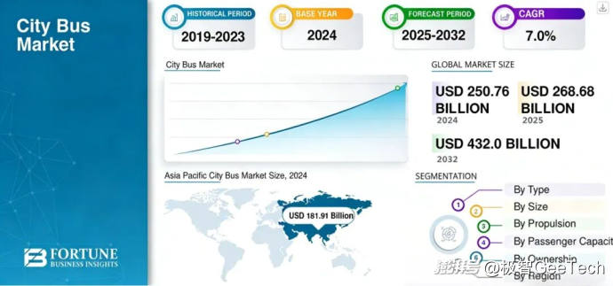 根据全球权威研究机构Fortune Business Insights测算,全球城市客车市场规模预计2032年将达4320亿美元,仅智能化升级就将催生超千亿美元市场,构成自动驾驶巴士“存量替代”的坚实地基。
