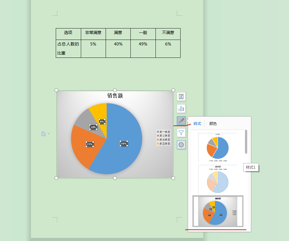 在图表类型中选择“饼图”,会弹出一个示例饼图以及一个“数据表”窗口。此时,“数据表”中的数据就是饼图的数据源。