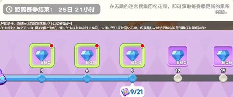 需要注意的是,在赛季期间新推出的饼干角色和新法宝卡牌,无法在当前赛季的无限的迷宫中使用。如果玩家在上一个赛季的最终段位达到了白银1或以上,那么在新赛季开启时,可以直接跳过第1关到第3关的挑战,这些关卡的回忆花瓣任务会自动完成,玩家可以从第4关开始挑战,这能有效提升资源获取的效率。玻璃迷宫的整体玩法需要玩家关注赛季时间、净化节点,并合理规划资源,重点培养火、水、风、光、暗五系的核心队伍。