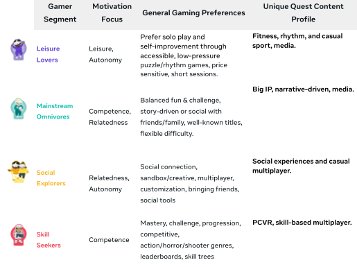2025年,Meta提出了一套代表当今VR多元受众群体的玩家原型:休闲爱好者、主流杂食者、社交探索者和技能追求者。详情可阅读Meta Connect 2025大会的专题文章《Meta 2025玩家画像出炉:四大核心群体与VR游戏增长策略》。