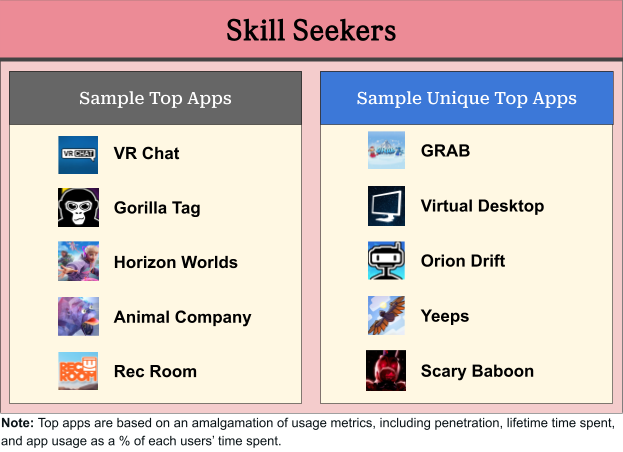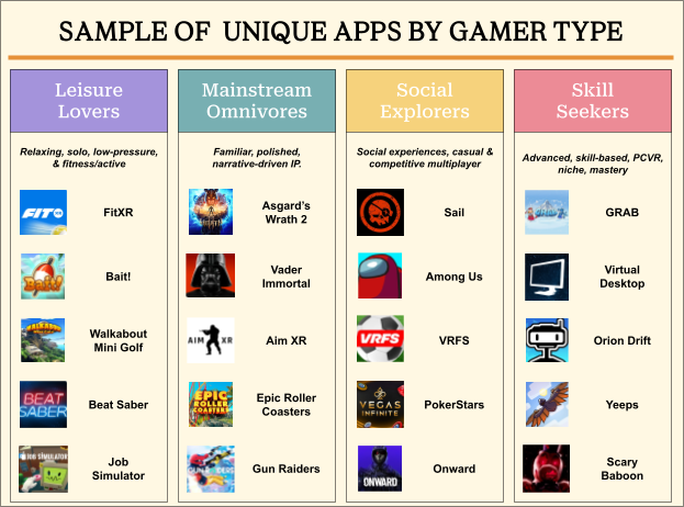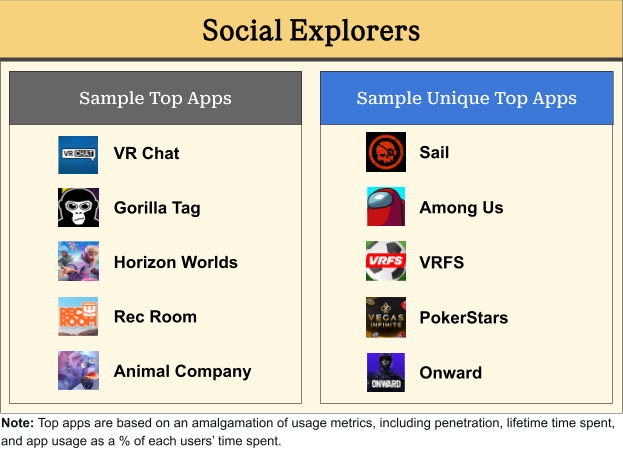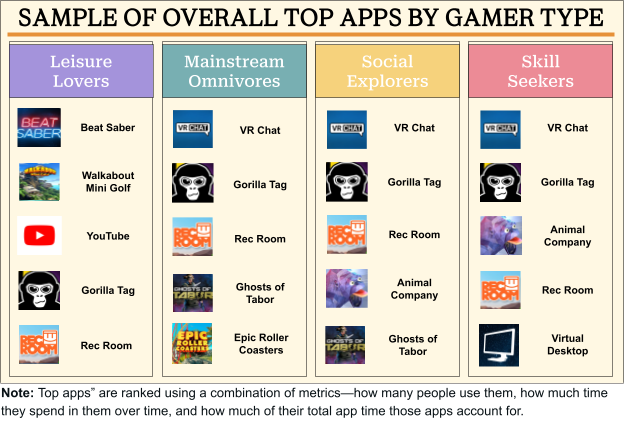 部分应用在各类玩家群体中脱颖而出:VRChat、Gorilla Tag和Rec Room在应用使用指标中均常居榜首。虽然这些数据无法直接指导开发者如何针对不同细分群体开发应用,但确实揭示了VR领域普遍有效的成功模式。