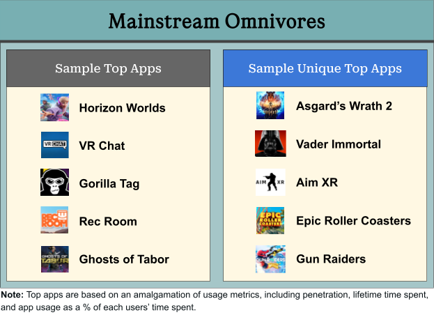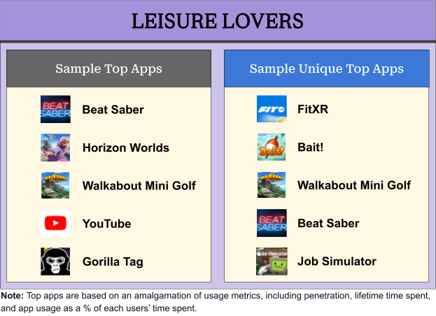 值得注意的是,休闲爱好者最常用的应用中包含部分单人游戏(如《Beat Saber》和《Walkabout Mini Golf》),这与他们偏爱单人游戏的倾向形成反差。《Beat Saber》尤其值得关注,它既被视为游戏,又被当作趣味健身方式。