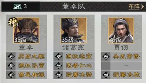 董卓的主动技能“独断专权”是阵容的起手控制。这个技能可以强制转移我方全体的统率值到董卓自己身上,同时随机对三名敌方单位施加挑衅和异常状态,比如技穷或牵制。这个效果与贾诩的技能形成了第一层控制闭环。当被挑衅的目标受到贾诩“纵傀”技能影响时,触发混乱的概率会显著提升。诸葛亮的“料敌机先”则构成了第二重加速引擎,每回合可以叠加层数,在敌方释放技能时触发智力比拼,成功后不仅能造成伤害,还能附加技穷或牵制效果。