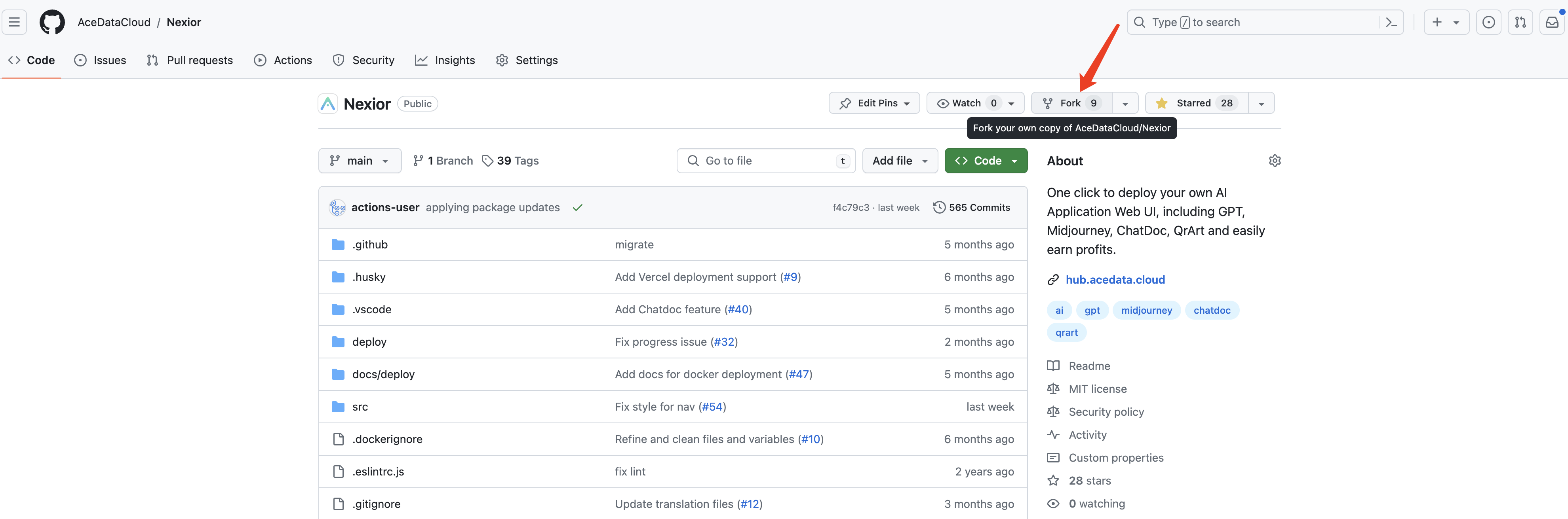 首先打开 Nexior 的 GitHub 仓库,地址为:github.com/AceDataClou…,然后注册或登录 GitHub 账号,点击 Fork,克隆一份代码到自己的本地仓库,如图所示: