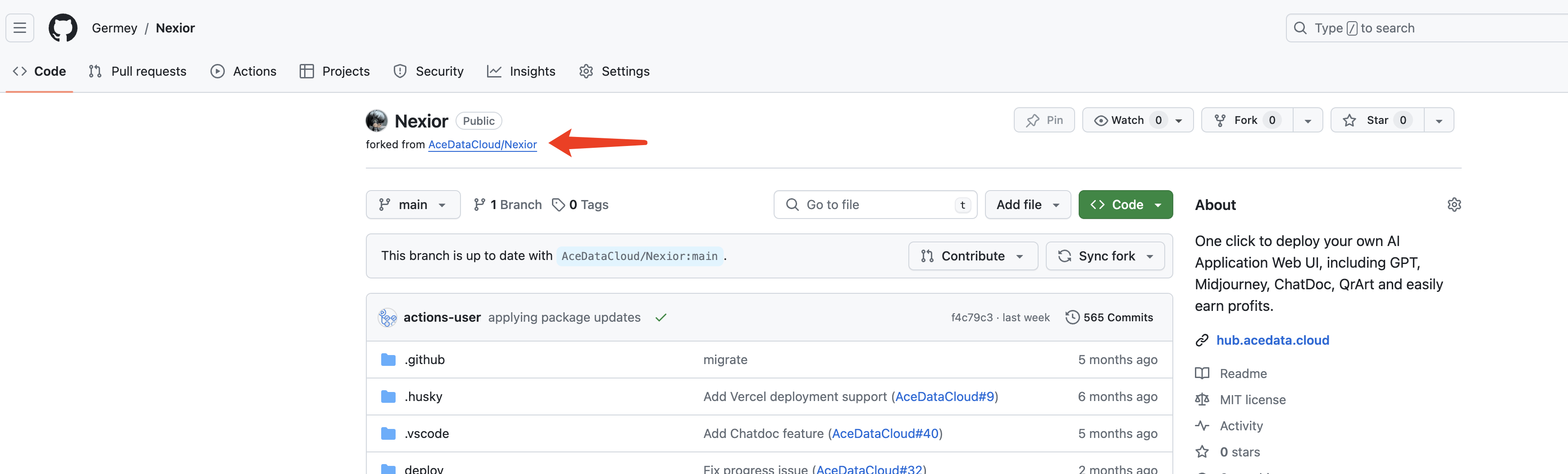 这里的示例账号是 Germey,所以可以看到这里我们就 Fork 到了 Germey 这个用户下,同时有一个 forked from AceDataCloud/Nexior 的字样,这样准备工作就完成了。