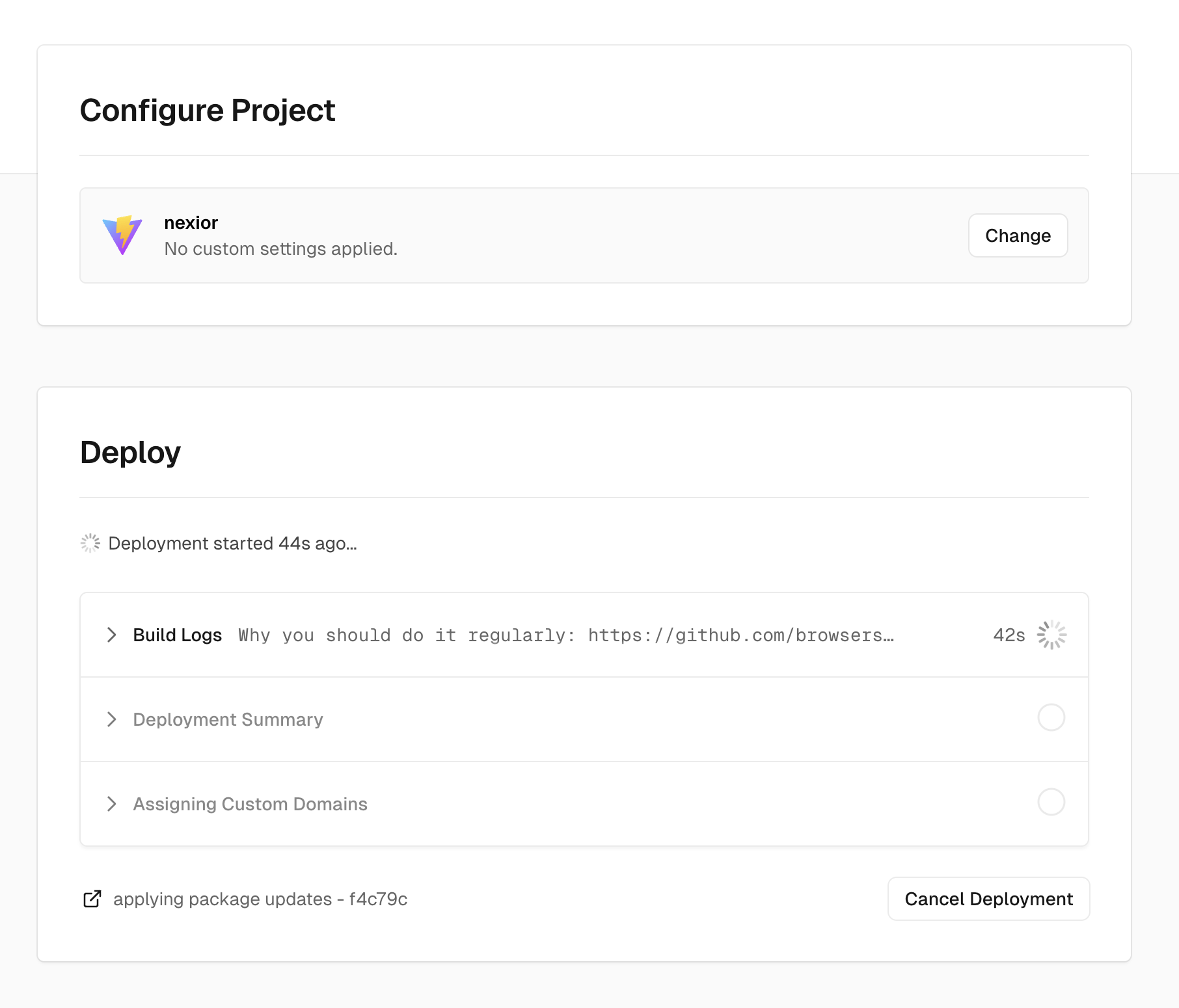 Vercel 是一个可以帮助快速部署项目网站的平台,我们可以利用它直接和 GitHub 仓库对接,然后把 GitHub 仓库的源代码快速部署到线上,下面介绍下 Vercel 部署 Nexior 项目的流程。