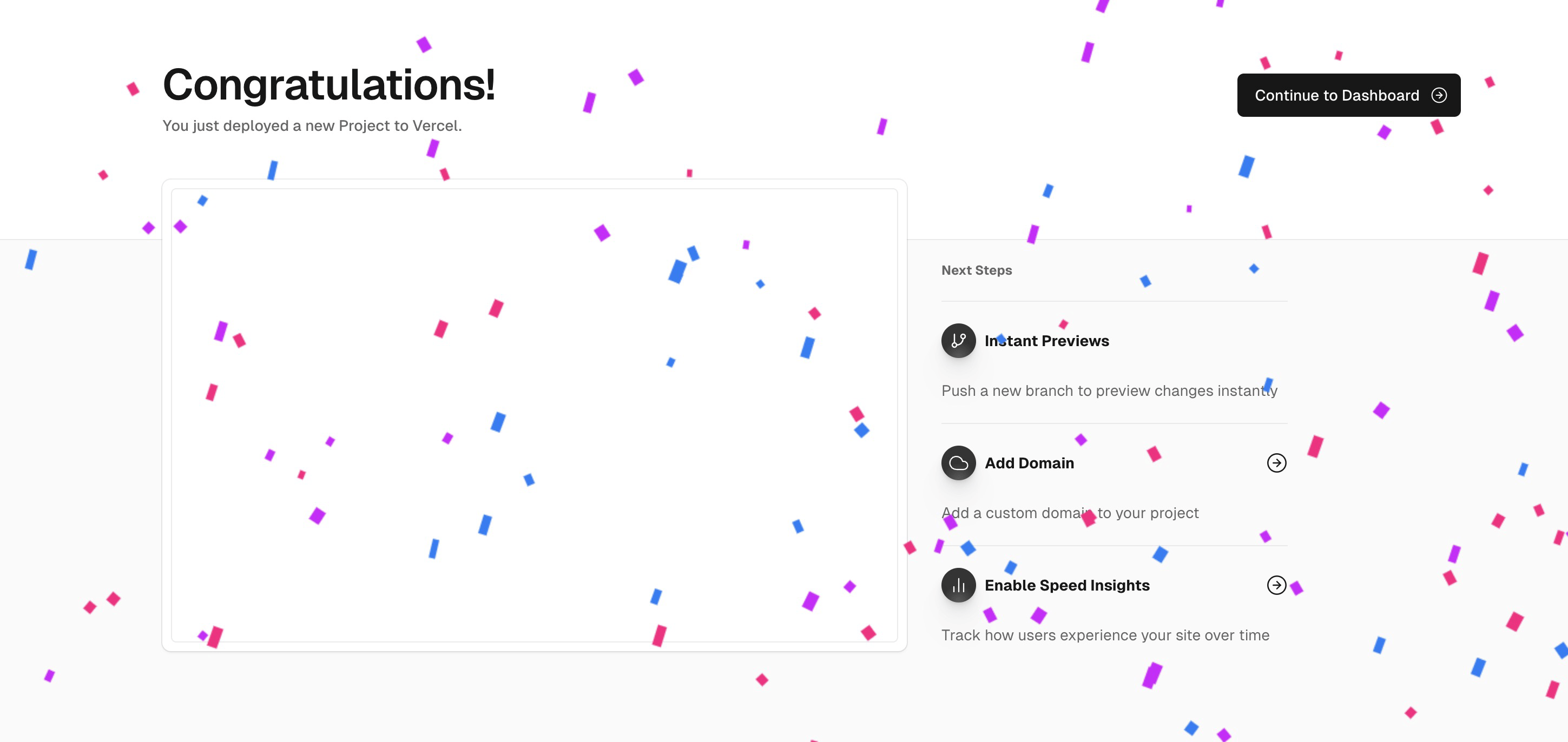 点击 Continue to Dashboard,我们便可以看到 Vercel 为我们生成的预览域名,如图所示: