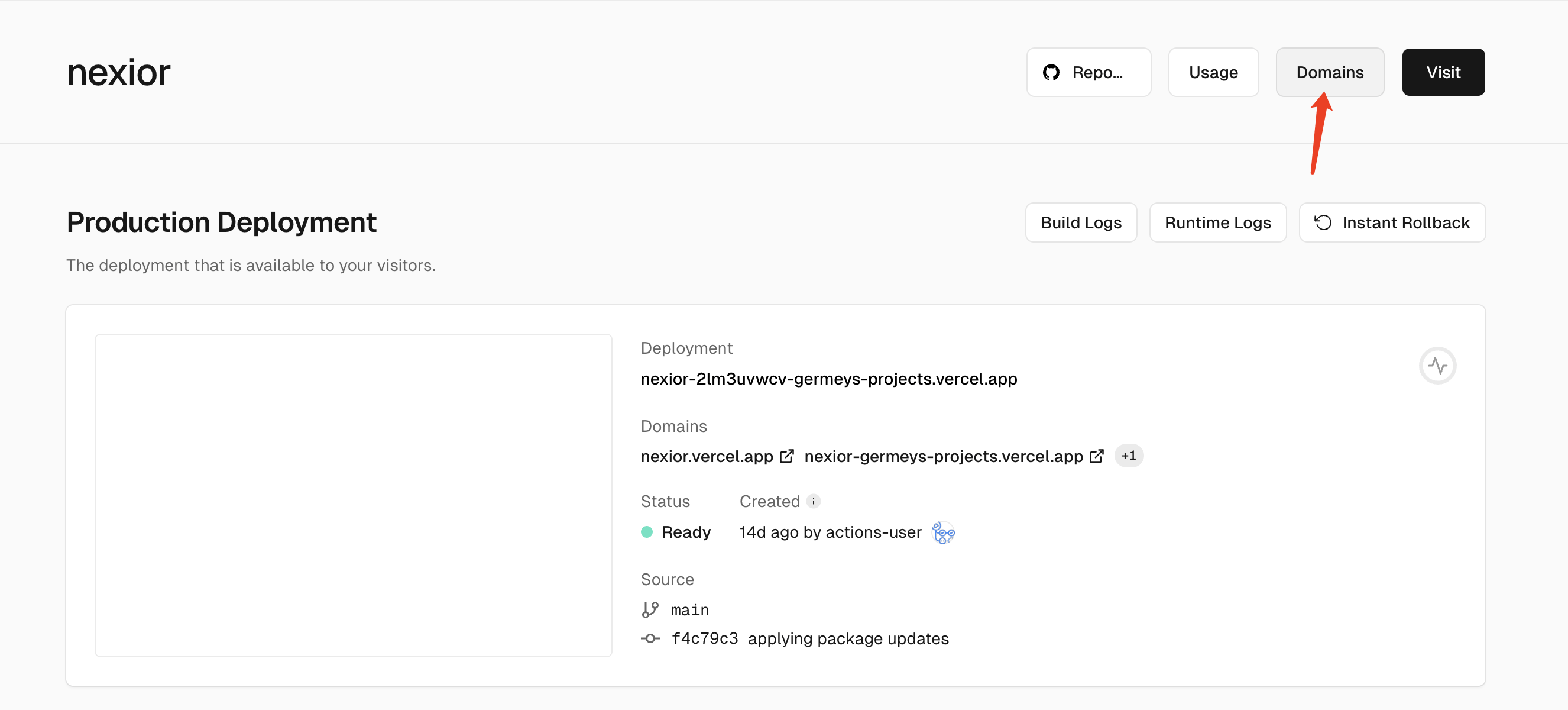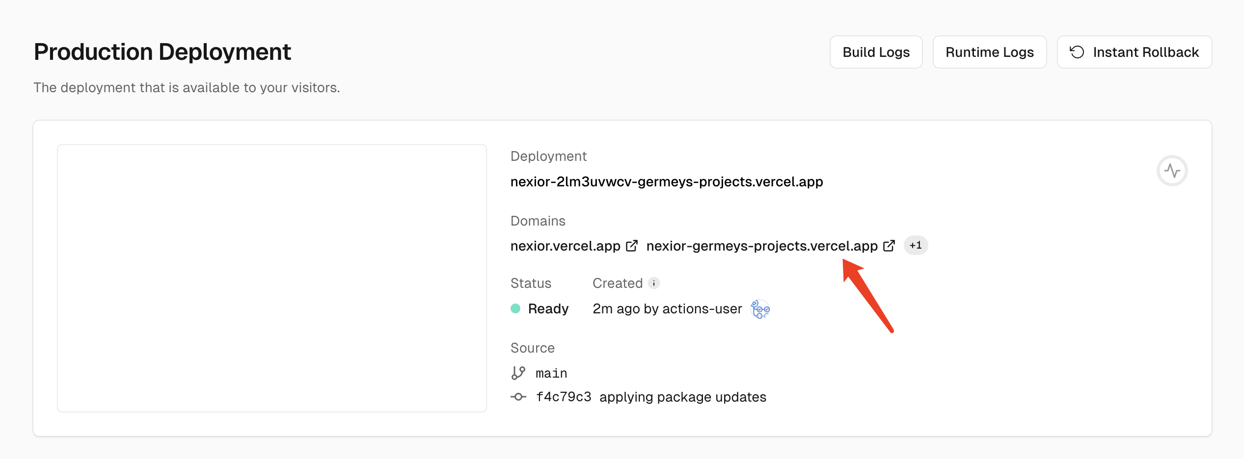 此时直接打开这个链接,比如这里的样例地址是 nexior-germeys-projects.vercel.app/,打开之后,我们便可以看到 Nexior 项目的运行情况了。
