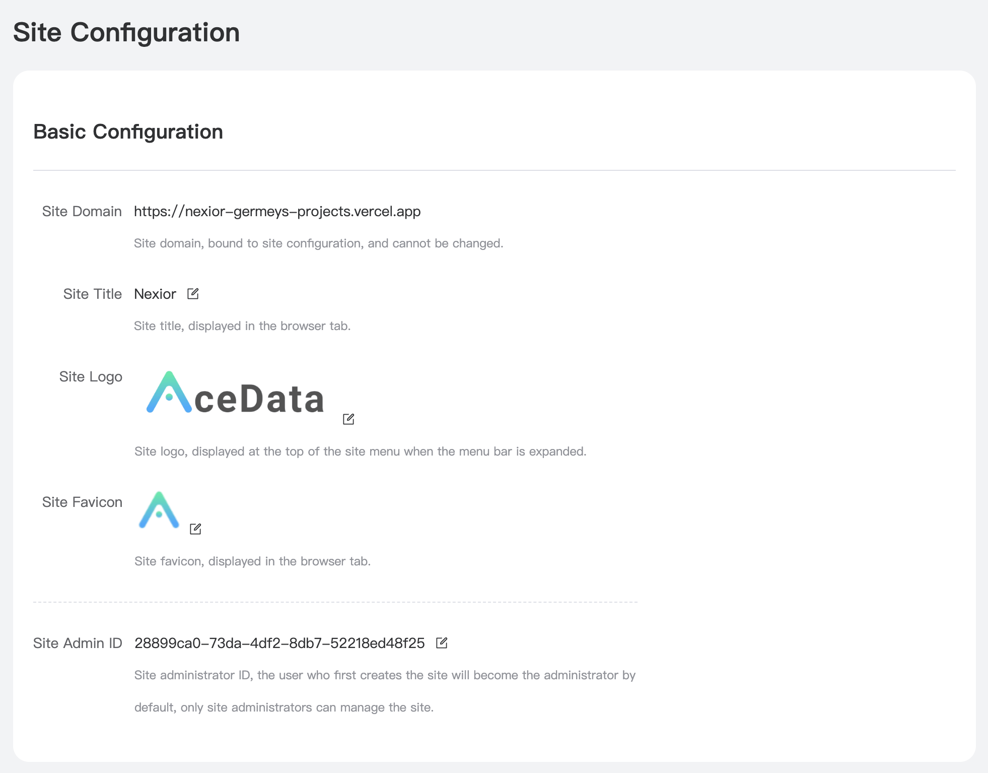 打开之后注册登录一下,比如用邮箱、GitHub 登录都是可以的,登录完毕之后便可以看到一个配置页面,比如 Site Configuration,我们可以自行修改该站点的标题、Logo、Favicon、管理员等信息,如下图所示: