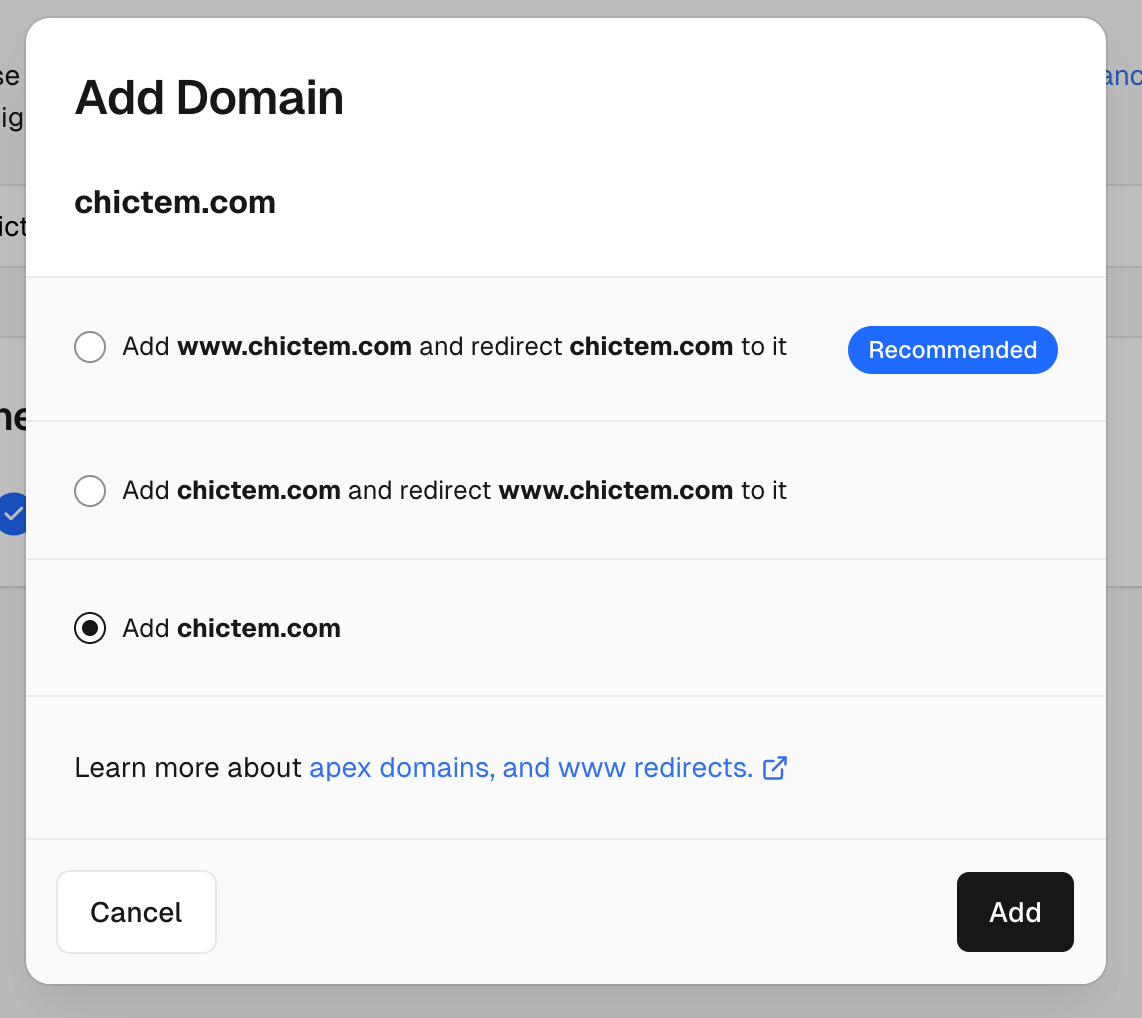 接下来 Vercel 提示要选择域名配置的选项,推荐我们也添加一个 www 开头的域名,这个可加可不加,添加了之后就可以 www 开头的域名也能访问到此网站。这里我们直接选择最后一项直接添加根域名: