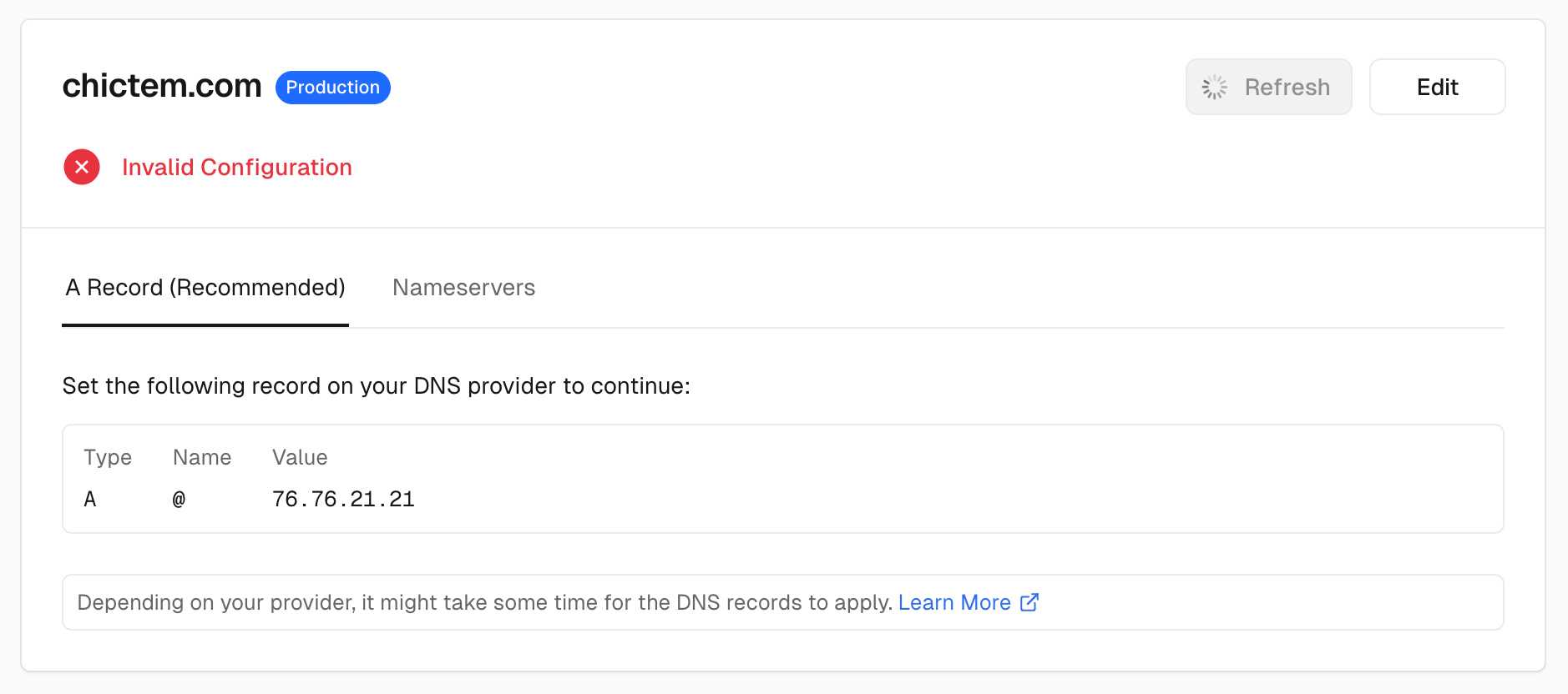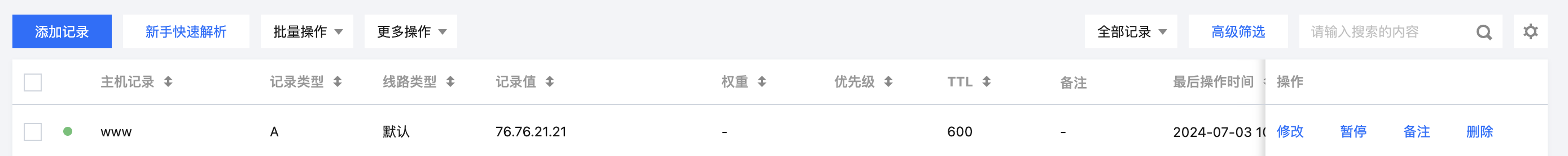 这里让我们添加一个 A 记录,解析到 76.76.21.21,我们这时候需要转到域名服务商这里配置下 DNS。