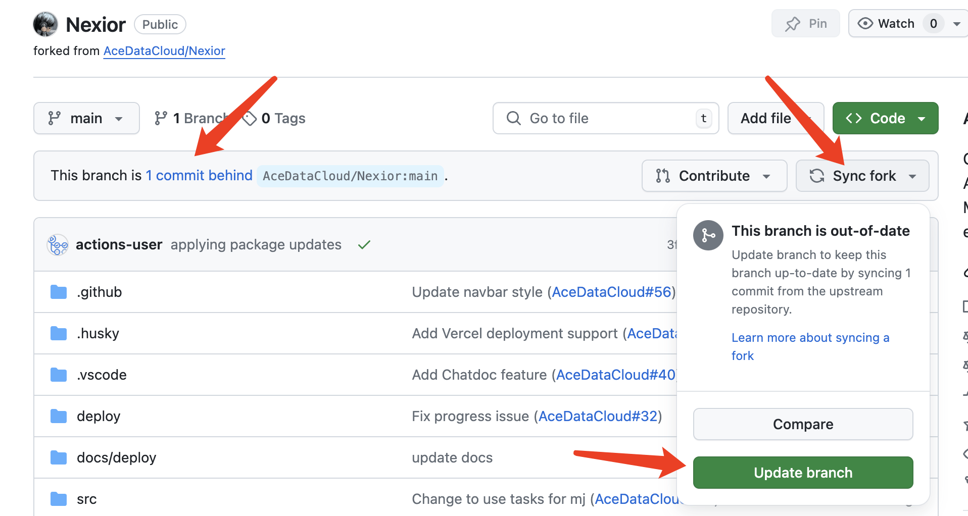 其实很简单,回到 GitHub 里面我们 Fork 的代码仓库,这里可以看到我们原本 Fork 的代码仓库已经落后于官方 Nexior 源代码几个版本了,我们可以直接点击 Sync fork 按钮,然后点击 Update branch 就可以了: