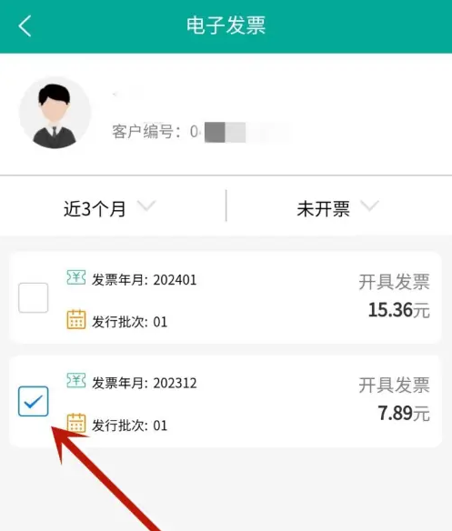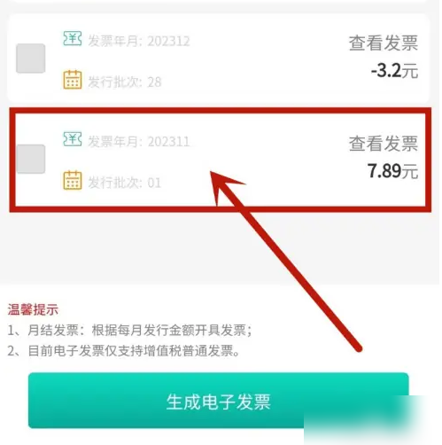 勾选你要开发票的一项点击【生成电子发票】。发票是每个月一项。