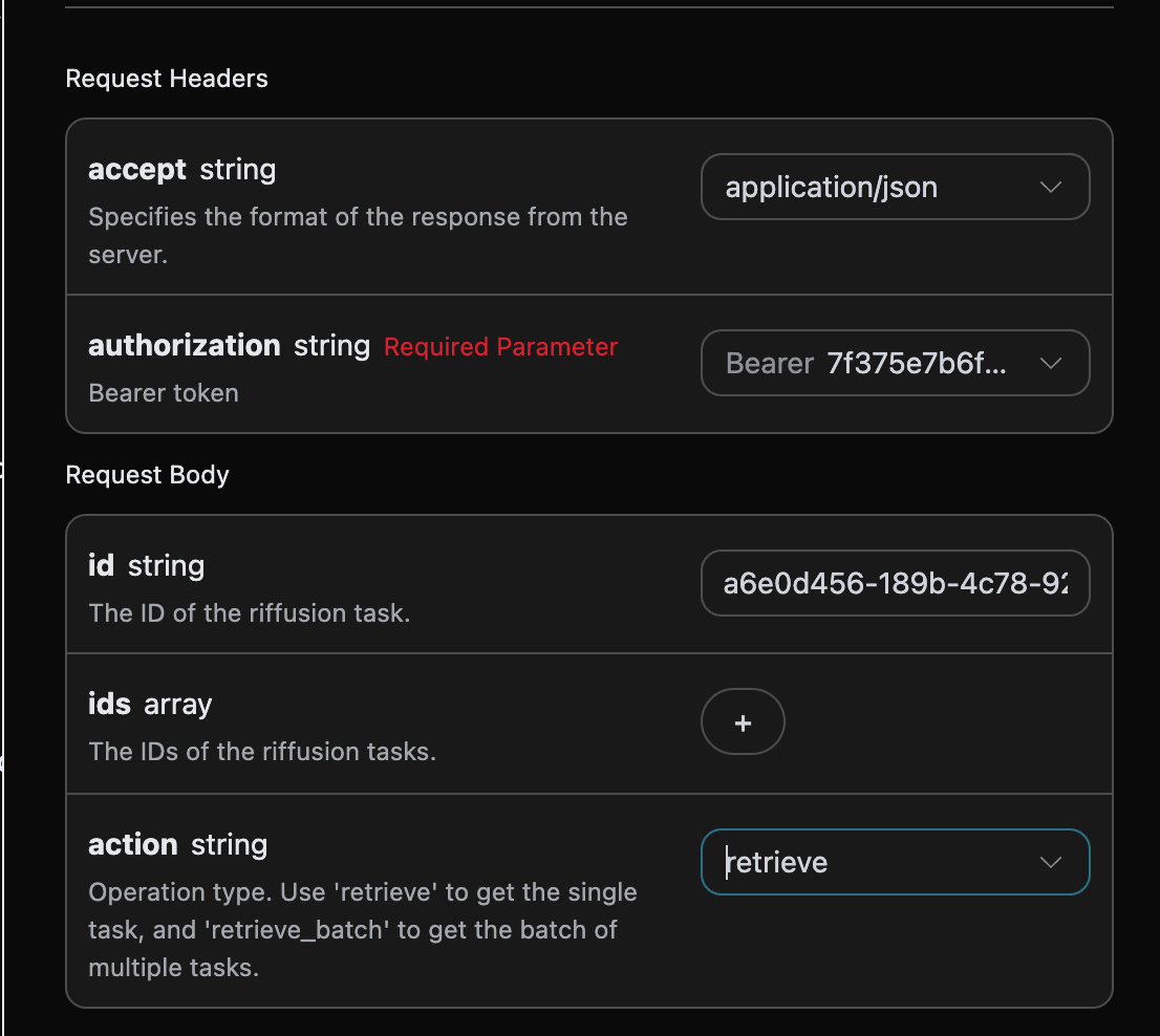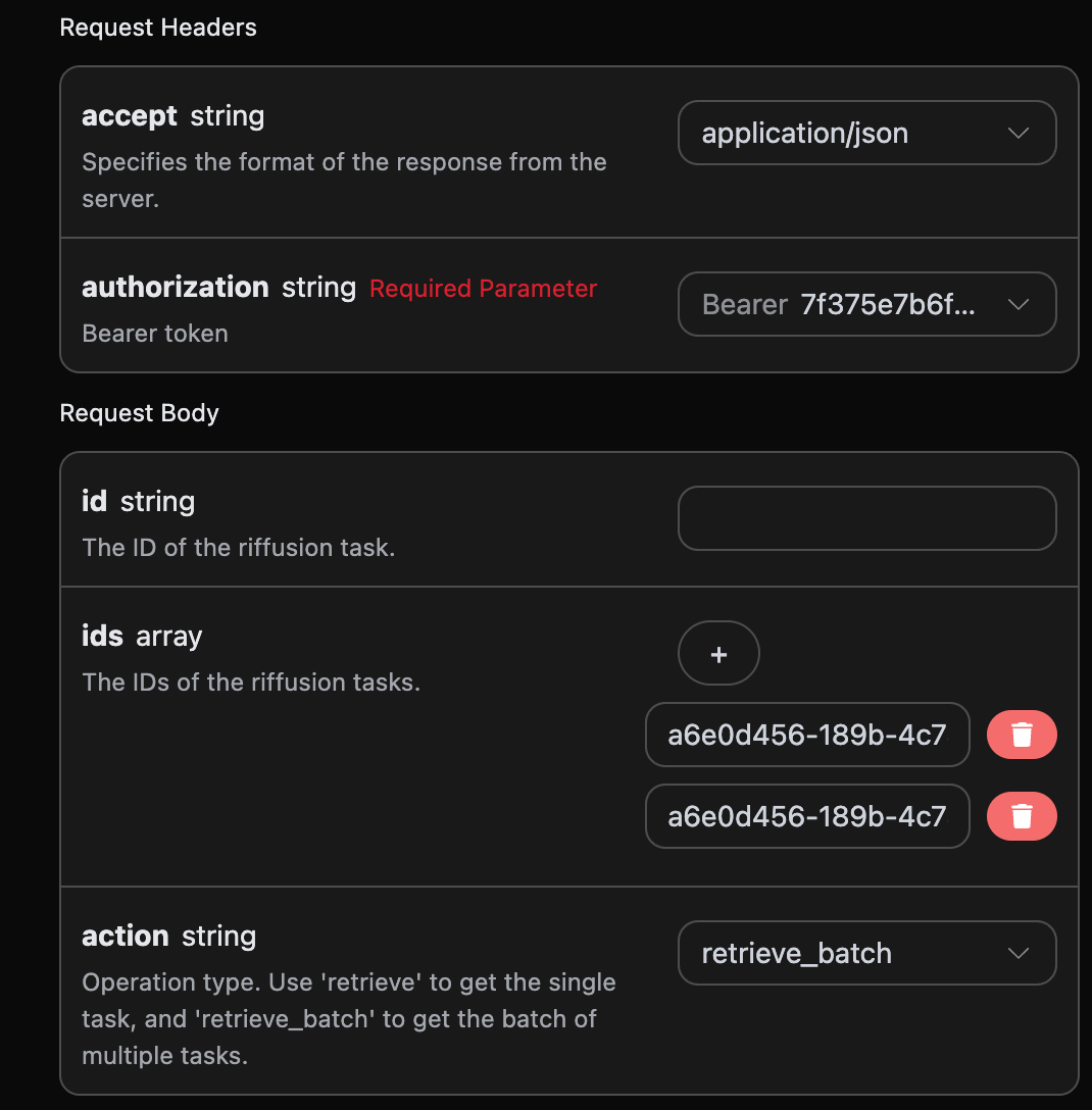 success: 当前视频生成任务的状态。task_id: 当前视频生成任务的 ID。trace_id: 当前视频生成的追踪 ID。data: 当前图像生成任务的结果列表。批量查询多个任务 ID 的详情,操作方法选择 retrieve_batch。