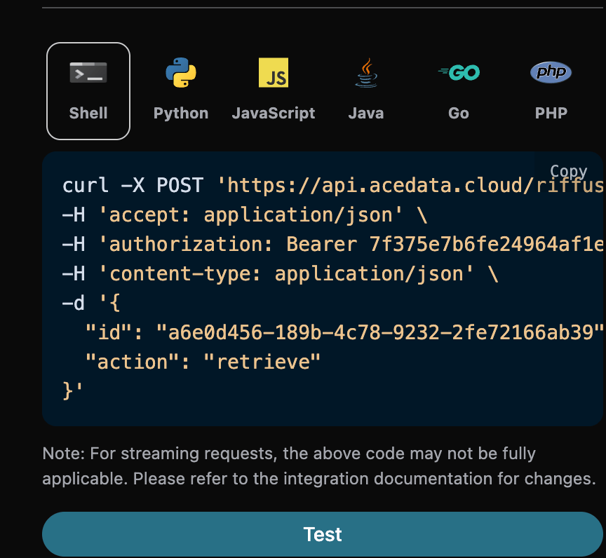 页面右侧会自动生成多种语言的代码示例,如下图所示: