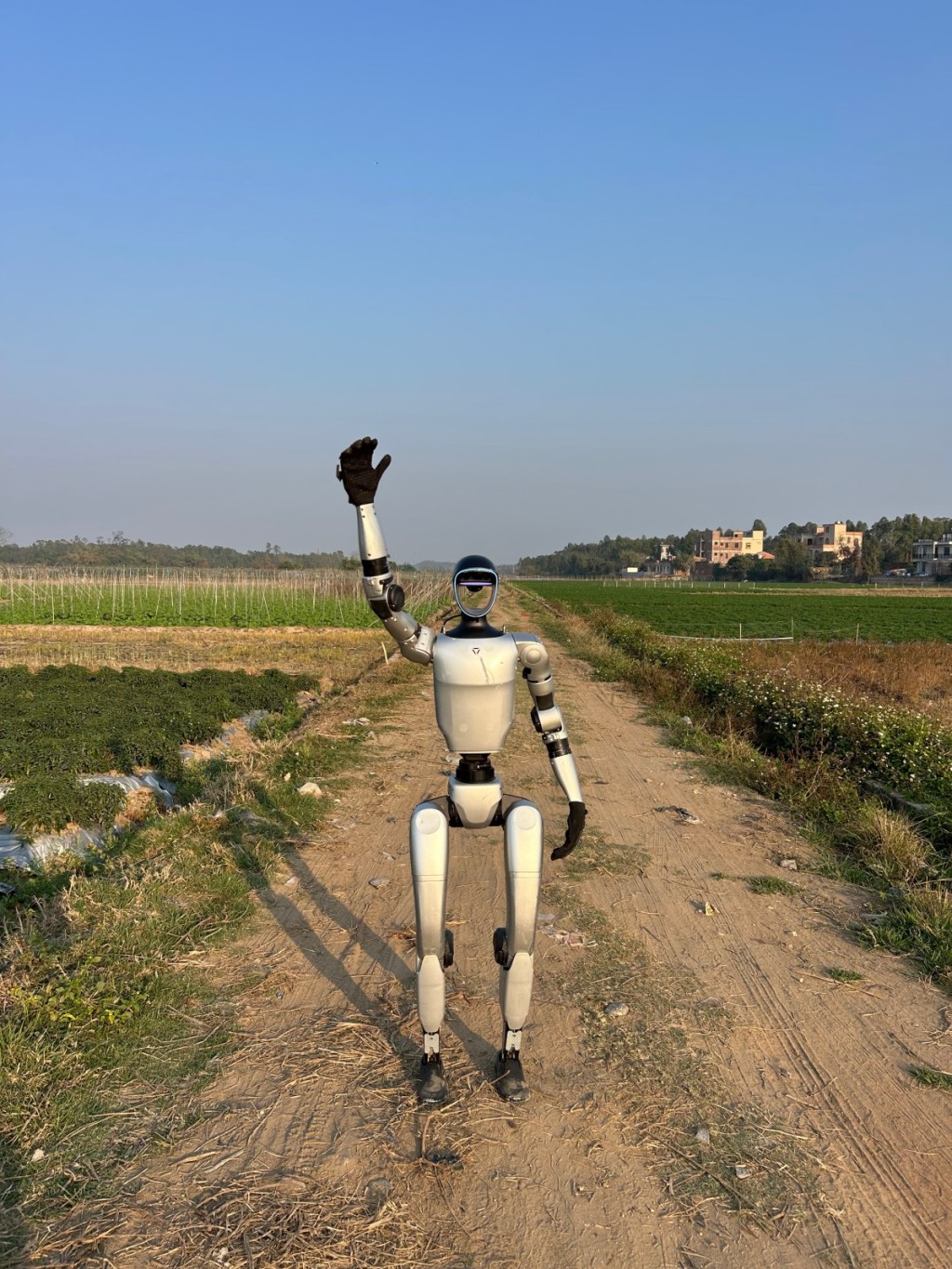 小雷哥和两名年轻员工跳进田里,“救起”机器人。他心里庆幸,好在田地是软质的,机器人只是沾一身泥,没摔坏关节。