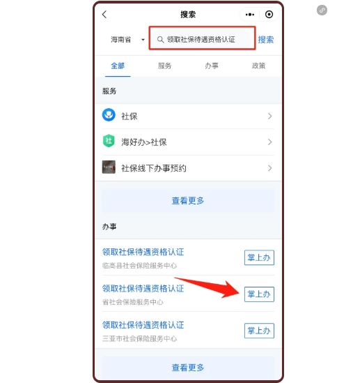 第二步:在搜索栏中输入“领取社保待遇资格认证”,点击搜索。在结果中选择退休归属地社保经办机构或省社会保险服务中心,点击“掌上办”。