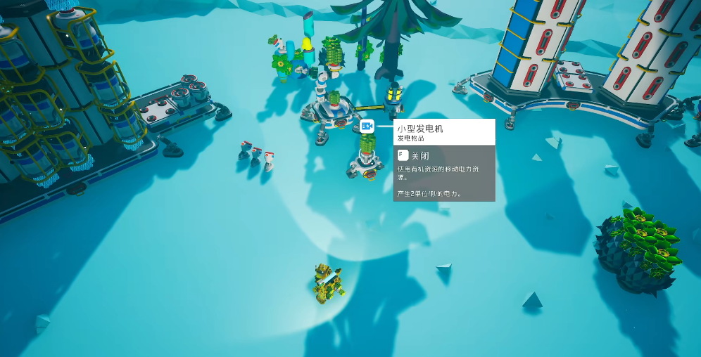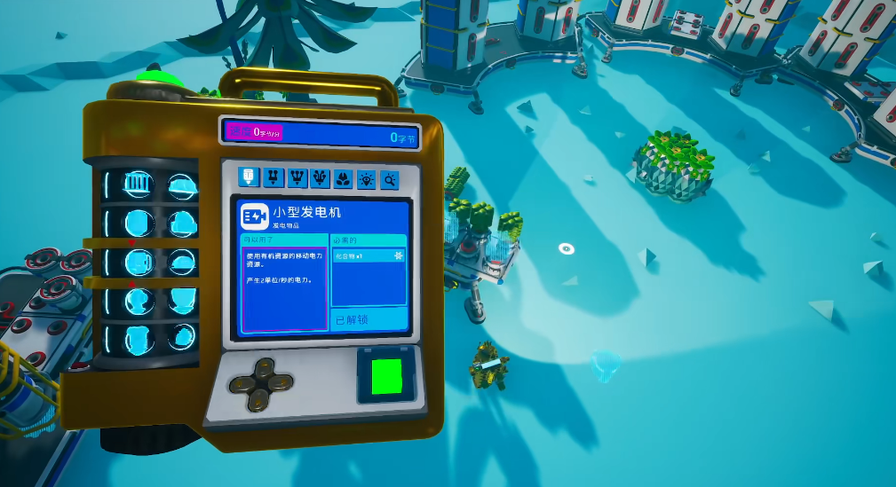 二级电力系统所需材料方面,则主要是2个自动机械臂、2个大型平台B、3-5个无害植物种子、3-5个树液采集器、1个熔炼炉、1个大型储存装置、4个中型发电机、1-2个中型资源罐,沿用一级流程,树液采集器采集有机物后,通过熔炼炉将其炼制成碳,再由自动机械臂抓取碳,驱动中型发电机发电,稳定输出36单位电量,满足大气冷凝机等关键设施的用电需求。