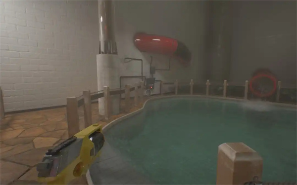 滑完蓝色滑梯后下楼梯,可以在旁边的泳池找到。