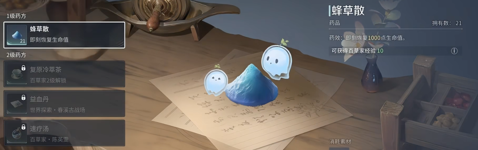 百家系统最特别的地方就是给每一个玩家赋予了更加丰富的生存空间。百草家不但是植物的采集者,也是药理学的研究者。本职业可以采集各种植物、调配各种药剂,可为战斗受伤人员伤残部位恢复提供各种各样的物质支援。这样自给自足的游戏玩法大大拓展了玩家在副本外的活动内容,也加强了游戏的沉浸感。而“肴馔家”使玩家在厨房和食材之间找到了乐趣,既可以做出提高属性的食物,又可以在探索的过程中保持良好的体力。因此,玩家在长时间的探索中就多了份依靠和谋略。